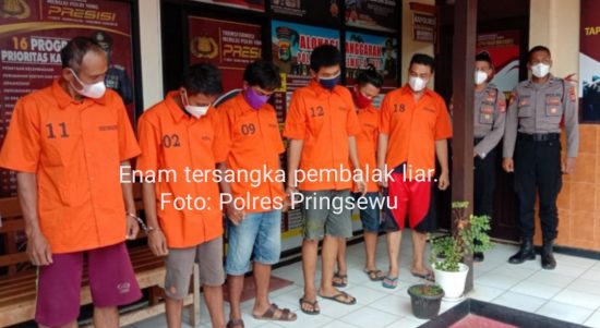 PRINGSEWU – Enam tersangka berikut satu truk berisi kayu ilegal dan sebuah sedan pengawal, diamankan polisi bersama Polisi Kehutanan (Polhut). Para tersangka