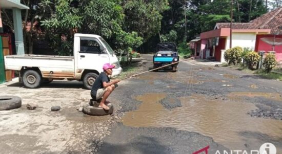 Warga di Kampung Cibentang, Desa Muaracikadu, Kecamatan Sindangbarang, memancing ikan di lubang di tengah jalan provinsi yang rusak parah. (Foto: Antara) JAKARTA–Pemerintah