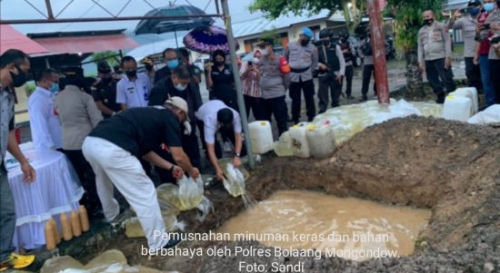 BOLMONG – Polres Bolaang Mongondow Rabu, Sulawesi Utara, memusnahjan ribuan liter minuman keras dan bahan berbahaya merkuri, Rabu (15/9/2021). Kegiatan yang di