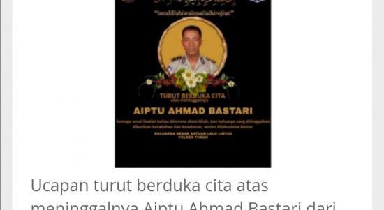 TUBAN – Kabar duka datang dari keluarga besar Korps Bhayangkara Tuban. Salah satu anggota Satlantas Polres Tuban Aiptu Ahmad Bastari meninggal dunia