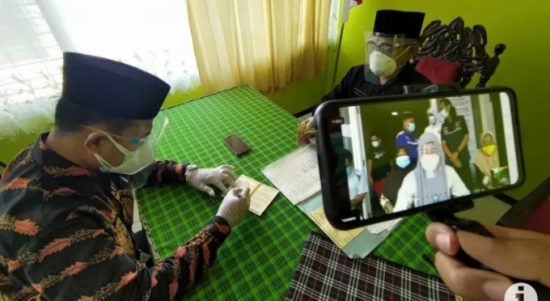TULUNGAGUNG — Seorang wanita muda pengidap Covid-19 menjalani pernikahannya secara virtual dari asrama Covid-19 Rusunawa IAIN Tulungagung dengan mempelai pria yang menjalani