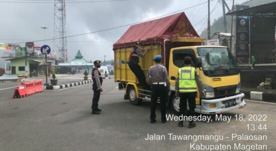 MAGETAN–Tim Satgas PMK Kabupaten Magetan Jawa Timur, bersama Polres Magetan, melakukan pengecekan secara ketat mobilitas hewan ternak, di Posko Check Point Cemoro