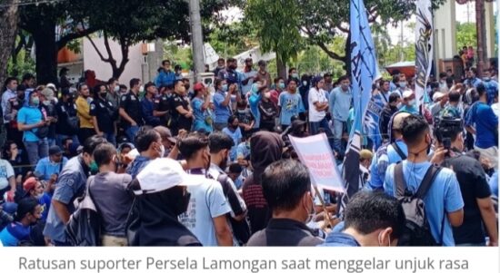 LAMONGAN–Mengalami kekalahan berturut-turut di BRI liga 1, Persela Lamongan kembali didemo oleh ratusan suporternya di depan Kantor Sekretariat Persela, Jalan Lamongrejo, Rabu