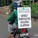 Konvoi sepeda motor membagikan selebaran khilafah di Jakarta. JAKARTA–Petugas Direktorat Reserse Kriminal Umum (Ditreskrimum) Polda Metro Jaya menangkap pimpinan Khilafatul Muslimin bernama