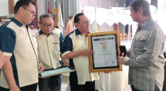 Ketua Umum SMSI Firdaus menyerahkan penghargaan pin emas untuk Prabowo Subianto kepada Hashim Sujono Djojohadikusumo. (ihd) JAKARTA – Menteri Pertahanan Jenderal TNI