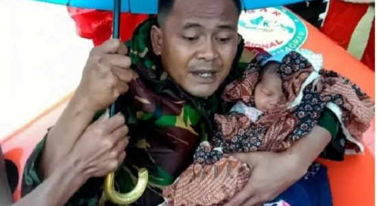 BANDA ACEH–Prajurit Tentara Nasional Indonesia (TNI) bersama sejumlah relawan mengevakuasi bayi berumur empat hari dan ibunya, Salma (38), yang terjebak Banjir di