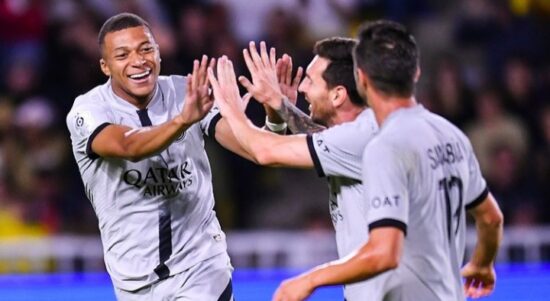Penyerang Kylian Mbappe (kiri) melakukan selebrasi gol bersama Lionel Messi dan Pablo Sarabia dalam pertandingan antara FC Nantes dan PSG. (Instagram @psg).