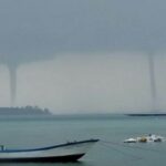 SINGARAJA – Angin puting beliung muncul di Kabupaten Buleleng, Bali, sementara di pantai sedang berlangsung upacara keagamaan, Senin (15/11/2021). Fenomena puting beliung