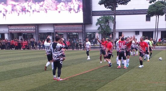 Tim Pati TNI AD melakukan selebrasi setelah KSAD Jenderal Dudung Abdurachman mencetak gol kelima ke gawang Selebriti FC. (Foto: Andi) JAKARTA –