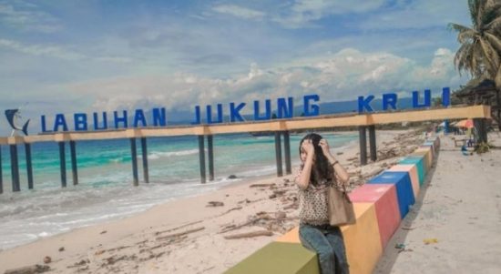 KRUI – Proyek talud penahan abrasi pantai sepanjang 271 meter milik Dinas Pariwisata Kabupaten Pesisir Barat, Lampung jebol dan rusak di beberapa