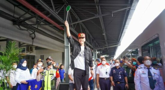 Gubernur Jawa Tengah Ganjar Pranowo melepas peserta Mudik Gratis Pemprov Jateng menggunakan KA Tawang Jaya Premium (Pasar Senen – Semarang Tawang), (Foto: kai.id)