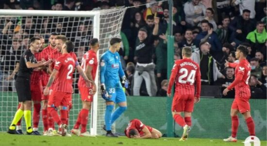 JAKARTA–Laga derbi antara Real Betis dan Sevilla di Piala Raja Spanyol (Copa del Rey) terpaksa dihentikan setelah kepala pemain Sevilla Joan Jordan