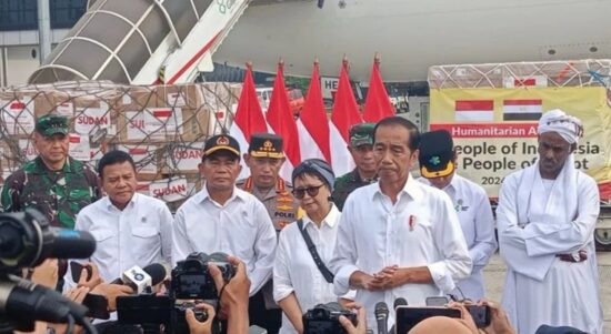 Presiden Jokowi memberi keterangan pers dalam acara pelepasan bantuan kemanusiaan untuk Palestina dan Sudan di Pangkalan TNI AU Halim Perdanakusuma, Jakarta, pada