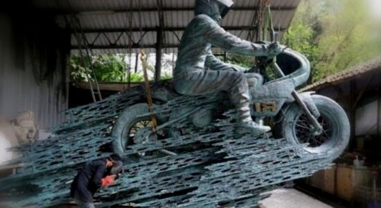 BANDUNG – Patung Joko Wododo naik motor karya seniman Nyoman Nuarta, diberangkatkan dari NuArt Sculpture Park Bandung ke Sirkuit Mandalika Lombok, Nusa