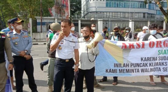 MEDAN–Ratusan pemilik dan pengemudi KPUM dan MRX trayek Medan-Amplas melakukan unjuk rasa di depan kantor Walikota Medan, Senin (21/2/2022) sekitar pukul 09.15