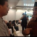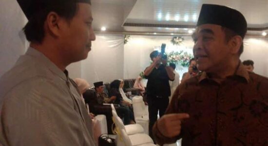 Sekjen Partai Gerindra Ahmad Muzani menyempatkan menyapa pembaca doa sebelum akad nikah dilaksanakan. (Istimewa) CILEGON – Di tengah kesibukan persiapan akad nikah