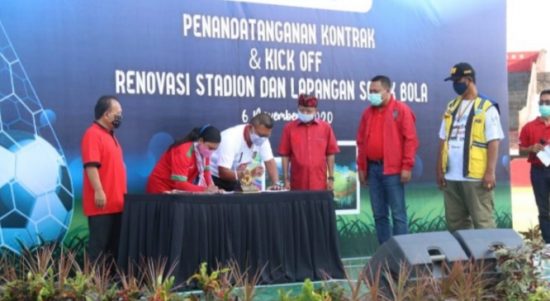 Gubernur Wayan Koster seusai meletakkan batu pertama renovasi Stadion Kapten I Wayan Dipta Gianyar. GIANYAR – Stadion Kapten I Wayan Dipta Gianyar,