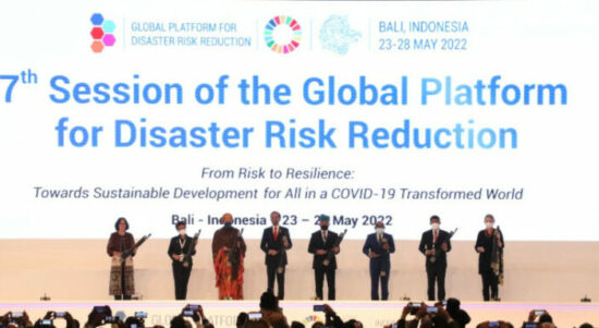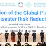 Presiden Joko Widodo membunyikan kentongan Bali saat membuka secara resmi GPDRR ke-7 di BNDCC, Bali, pada Rabu (25/5). BADUNG, BALI– Presiden Joko