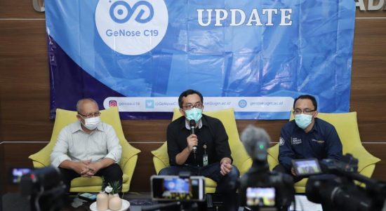YOGYAKARTA–Inventor GeNose C19 dr Dian Kesumapramudya Nurputra MSc PhD SpA dan Prof Dr Eng Kuwat Triyana MSi menyampaikan tentang kemajuan pengembangan teknologi