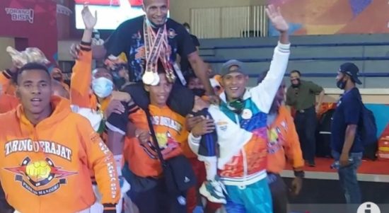 KABUPATEN MIMIKA–Manajer tim tuan rumah Papua Fransiskus Pederikus diarak oleh atlet usai Papua dinobatkan menjadi juara umum cabang ini pada Pekan Olahraga