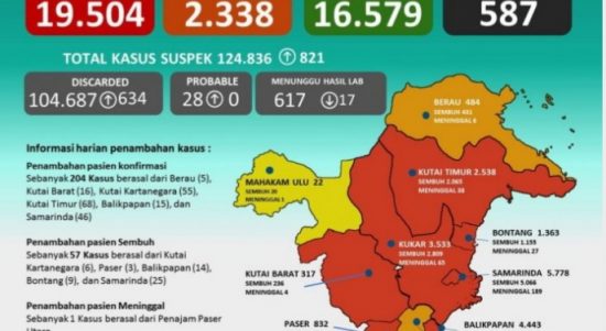 SAMARINDA – Angka terkonfirmasi Covid-19, Minggu (29/11/2020), kembali tinggi. Rilis Satgas Penanganan Covid-19 Kaltim mencatat 19.504 kasus positif, menyusul adanya tambahan 204