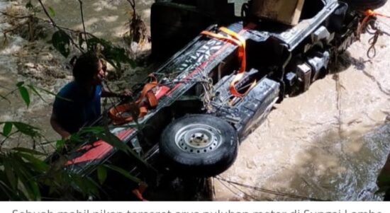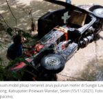 POLMAN–Sungai Lambe Lotong di Kabupaten Polewali Mandar, Sulawesi Barat, meluap karena intensitas hujan yang cukup tinggi. Akibatnya, satu unit mobil pikap yang