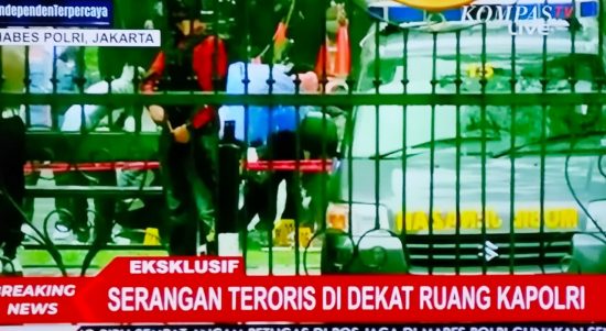 JAKARTA – Seorang terduga teroris berbusana perempuan, tersungkur di halaman depan kompleks Mabes Polri, Rabu (31/3/2021). Antara melaporkan, mobil Gegana Polri dan