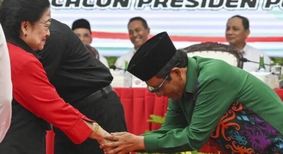 Calon Wapres Mahfud Md berjabat tangan dengan Ketum PDIP Megawati. (Antara Foto) JAKARTA – Calon wakil presiden nomor urut 3, Mahfud Md,