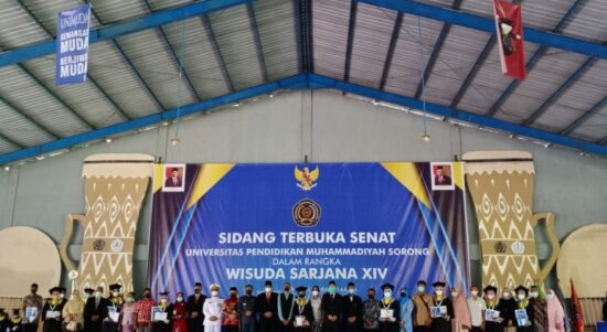 AIMAS–Sidang terbuka senat Universitas Pendidikan Muhammadiyah (UNIMUDA) Sorong dalam rangka wisuda sarjana angkatan XIV bertempat di sportorium UNIMUDA Sorong, Sabtu (4/12). Rektor