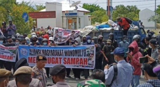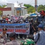 POLMAN – Dengan memboyong truk-truk penuh sampah, massa berunjuk rasa depan Kantor Bupati Polewali Mandar (Polman), Sulawesi Barat (Sulbar), Selasa (29/3/2022). Massa