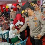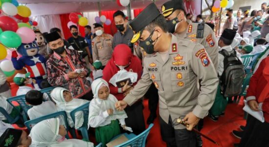 SURABAYA–Kapolda Jawa Timur Irjen Pol Nico Afinta bersama PJU Polda Jatim dan Forkopimda Kabupaten Sidoarjo mengikuti kegiatan Vaksinasi Merdeka Anak di Madrasah