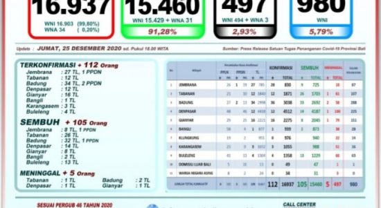 BALI– Satgas Penanganan Covid-19 Provinsi Bali mencatat pada Jumat (25/12/2020) ada penambahan pasien Covid-19 meninggal dunia sebanyak lima orang, sedangkan yang sembuh