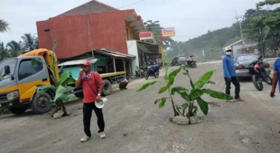 LEBAK–Dengan menanam pohon pisang di jalan dan melarang kendaran perusahaan untuk masuk, sejumlah warga melakukan aksi penutupan ruas Jalan Raya Cibayawak-Sawarna. Aksi