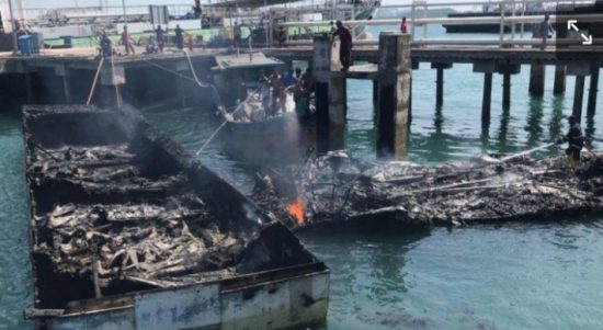 BATAM – Lima kapal yang bersandar di Dermaga Bea Cukai, Tanjung Uncang, Batuaji, Kota Batam, Kepulauan Riau, terbakar, Selasa (23/2/2021). Di antara