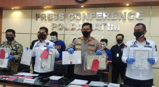 SURABAYA – Subdit V/Siber Ditreskrimsus Polda Jatim, Selasa (22/6/2021) siang, menggelar jumpa pers tentang penjualan hasil manipulasi dan atau pemalsuan data berupa