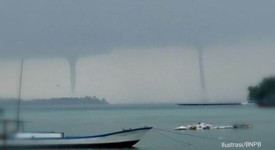 SINGARAJA – Angin puting beliung muncul di Kabupaten Buleleng, Bali, sementara di pantai sedang berlangsung upacara keagamaan, Senin (15/11/2021). Fenomena puting beliung