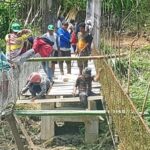 POLMAN – Perbaikan jembatan gantung, akses utama menuju Desa Lenggo, Kecamatan Bulo, Kabupaten Polewali Mandar, Sulawesi Barat yang rusak akibat diterjang Banjir