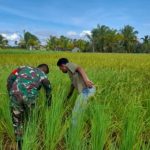 MEMPAWAH – Bintara Pembina Desa (Babinsa) Koramil 1202-04/Sungai Kunyit, Serda Ali Mustakim turun ke sawah mendampingi petani mengecek perkembangan tanaman padi di