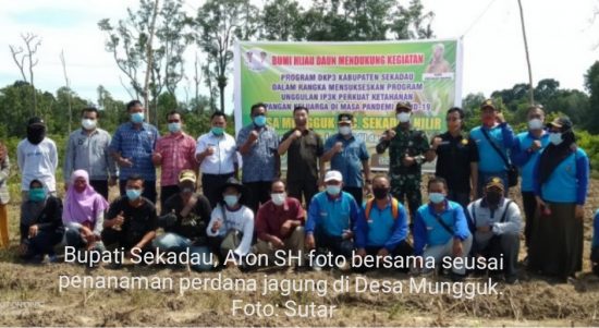 SEKADAU – Bupati Sekadau, Aron melaksanakan penanaman jagung perdana pada lahan kelompok tani (poktan) Bina Usaha Desa Mungguk, Kecamatan Sekadau Hilir, Kamis