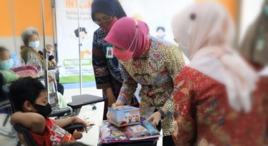 SEMARANG – Nadif Zafra (5) tampak senang saat Ketua Tim Penggerak PKK Provinsi Jawa Tengah Atikoh Ganjar Pranowo memberinya mainan, Selasa (15/2/