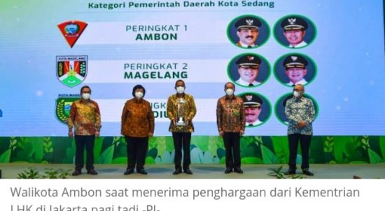 JAKARTA– Kota Ambon kembali menerima penghargaan Green Leadership Nirwasita Tantra. Kota Ambon mendapat penghargaan itu pada kategori kota sedang dengan menyabet peringkat
