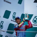 Pebalap tim Gresini Racing Enea Bastianini mengangkat tropi setelah sukses finis pada posisi dua MotoGP Malaysia di Sirkuit Sepang, Minggu (23/10/2022). (Bastie23)