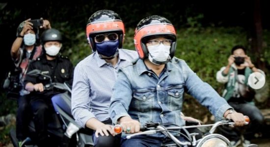 JAKARTA— Dua tokoh yang masuk dalam bursa calon presiden Pilpres 2024, Ridwan Kamil dan Agus Harimurti Yudhoyono (AHY), berboncengan di Kota Bandung, Jawa Barat.