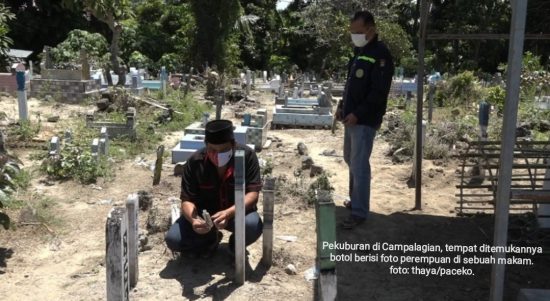 POLMAN– Warga di Kabupaten Polewali Mandar, Sulawesi Barat, dihebohkan penemuan botol berisi foto wanita tertanam di kuburan. Di balik foto ada tertulis