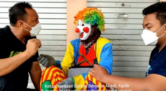 LAMONGAN – Demi menjaga keutuhan rumah tangga, ayah tiga anak ini rela banting tulang mencari nafkah dengan menjadi seorang badut. Pekerjaan tersebut