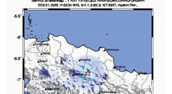 Peta pusat gempa dengan kekuatan magnitudo 4,1 di Kabupaten Sumedang, Jawa Barat, Minggu (31/12/2023). (BMKG) JAKARTA – Badan Meteorologi, Klimatologi, dan Geofisika